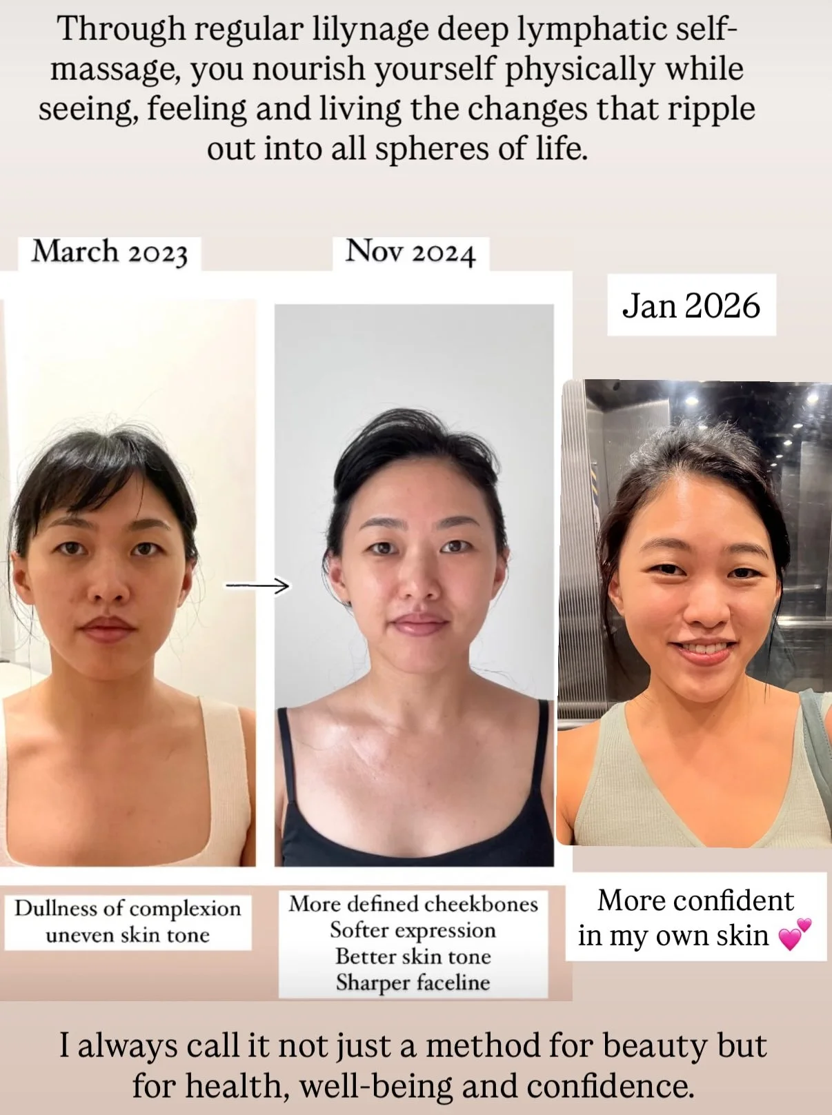 Through the Lilynage method of deep lymphatic self-massage, we support circulation and encourage detoxification by making our lymphatic system better able to remove excess fluid and waste. And these can be most visible especially in the face, neck, and chest area.